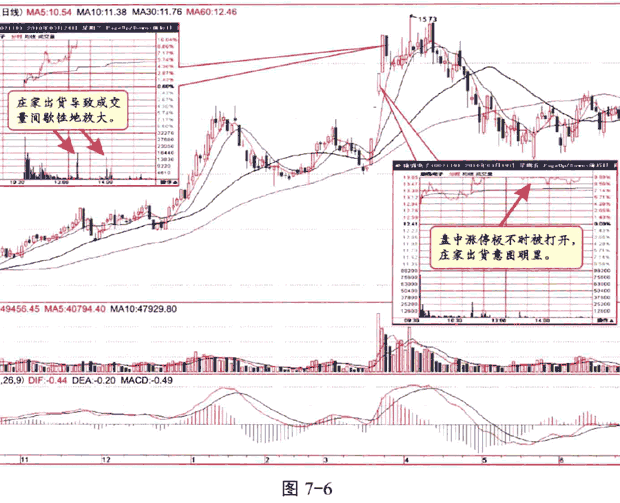涨停式出货有两种做法:一种是庄家不在涨停板价位挂大买单接盘,以免吃进更多的筹码,而是用对倒,分批买进上方自己的大抛盘,来引诱投资者追涨,并不时地对准下方的承接盘抛售手中的筹码;另一种是庄家用巨量将股价封至涨停后,不断将涨停板上自己的买单撤回往后排队。从表面上看,虽然涨停板上的买单数量没有明显的变化,但实际上庄家正对着投资者的买盘在抛售,如图7-6所示。