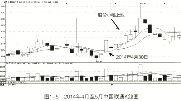 中国联通(股票代码:600050)作为中国股市中不折不扣的蓝筹股,在上证指数下跌的这段时间内,一直以横盘整理的态势持续运行,甚至到了2014年4月30日,还走出了一小波上涨行情,其抗跌性可见一斑(如图1-5)。